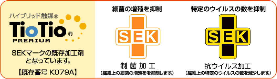 SEKマークとは「一般社団法人繊維評価技術協議会」が、効果・耐久性・安全性を審査し、一定の基準をクリアした加工品に対して、その品質を認証しているマークです。