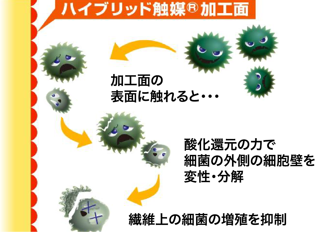 ハイブリッド触媒®は加工面に固着している成分が、細菌の外側の細胞壁に作用して変性や分解を起こし、増殖を抑えていると考えられます。