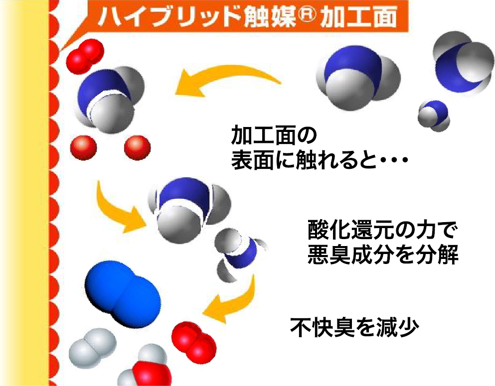 ハイブリッド触媒®は加工面に固着している成分が、悪臭成分を分解して臭わない成分に変換し、不快な臭いを減少させていると考えられます。