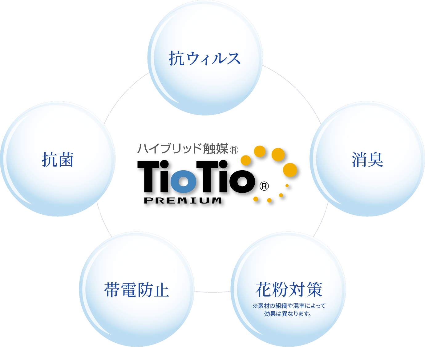 ハイブリッド触媒®「TioTio® PREMIUM加工/ティオ・ティオプレミアム加工」は、大阪大学産業科学研究所との連携研究契約によって生まれた多機能型触媒を使用した加工です。清潔で健康な暮らしを望む皆様のご要望に応える新たな加工技術として大きな注目を集めています。お肌に優しく敏感肌の方にも安心してご使用いただけます。
